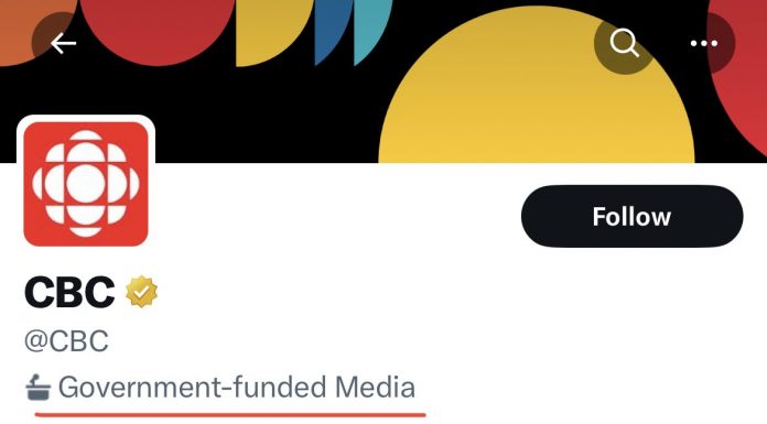 One of CBC's Twitter accounts now has a label which describes the broadcaster as "Government-funded Media."